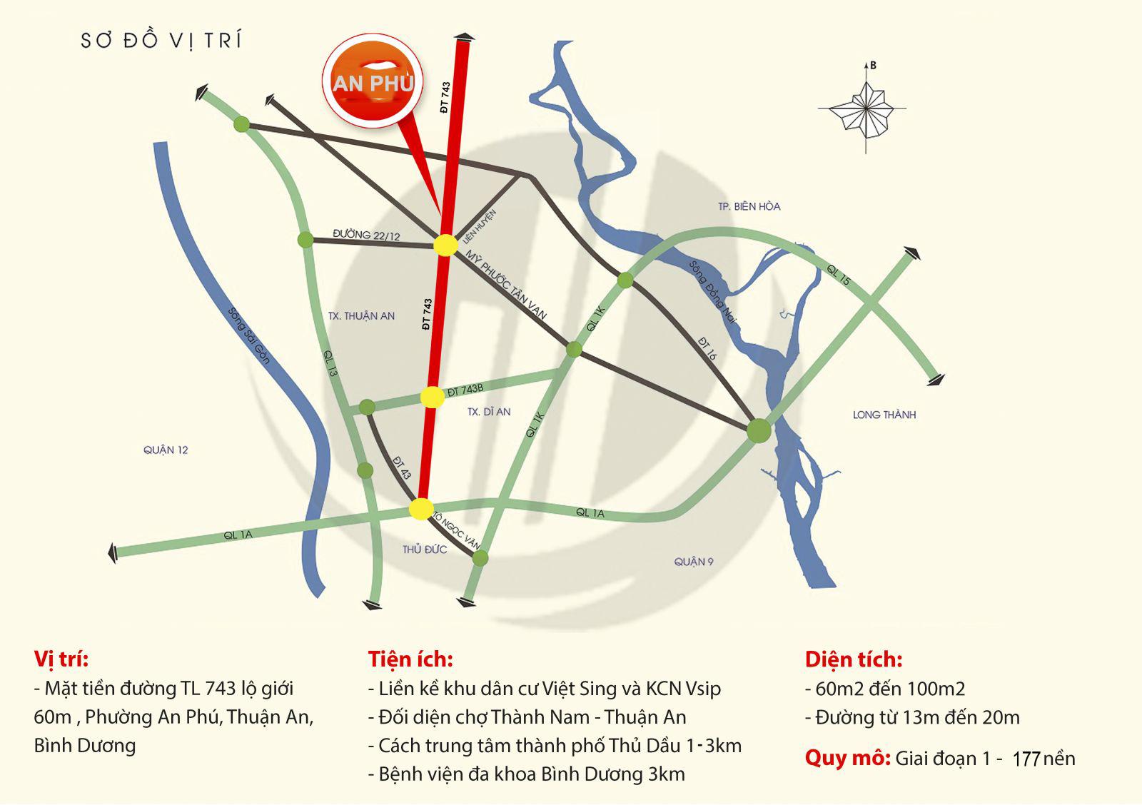 Vị trí: Mặt tiền Tỉnh lộ 743 ngay khu công nghiệp visip Việt Nam – Singapo. Khu an phú thuận an bình dương.